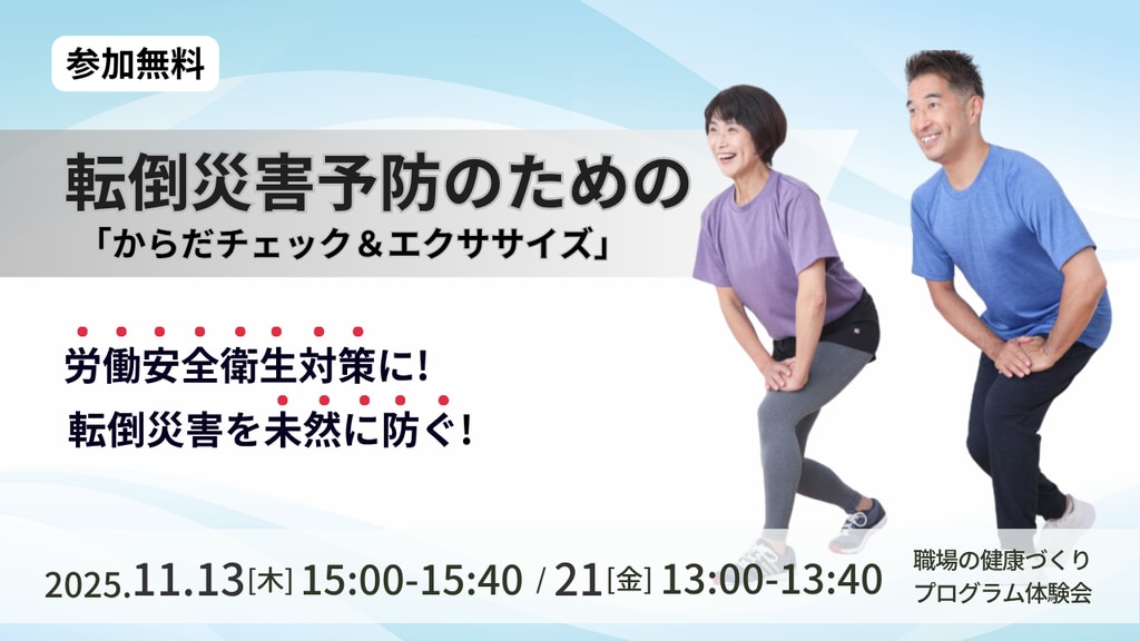 【職場の健康づくりプログラム体験会】転倒災害予防のための「からだチェック&エクササイズ」2023-07-27 08:032025年11月13日(木)15:00~15:40、11月21日(金)13:00~13:40記事を見る募集中健康経営労働災害対策