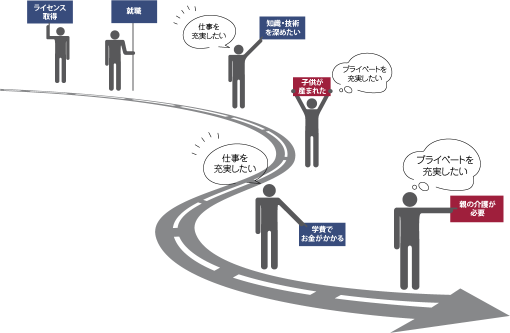 ⼈⽣の中にはいくつものキャリアの転換期があり、⾃らのライフサイクルに応じて、働き⽅も変化していきます。ライセンス取得後は、知識‧技術を⾝に着けキャリアアップを⽬指して、そして家庭を持ち⼦育てをする期間では、家族との時間を⼤切に、また、両親の介護が必要になる時期も訪れます。